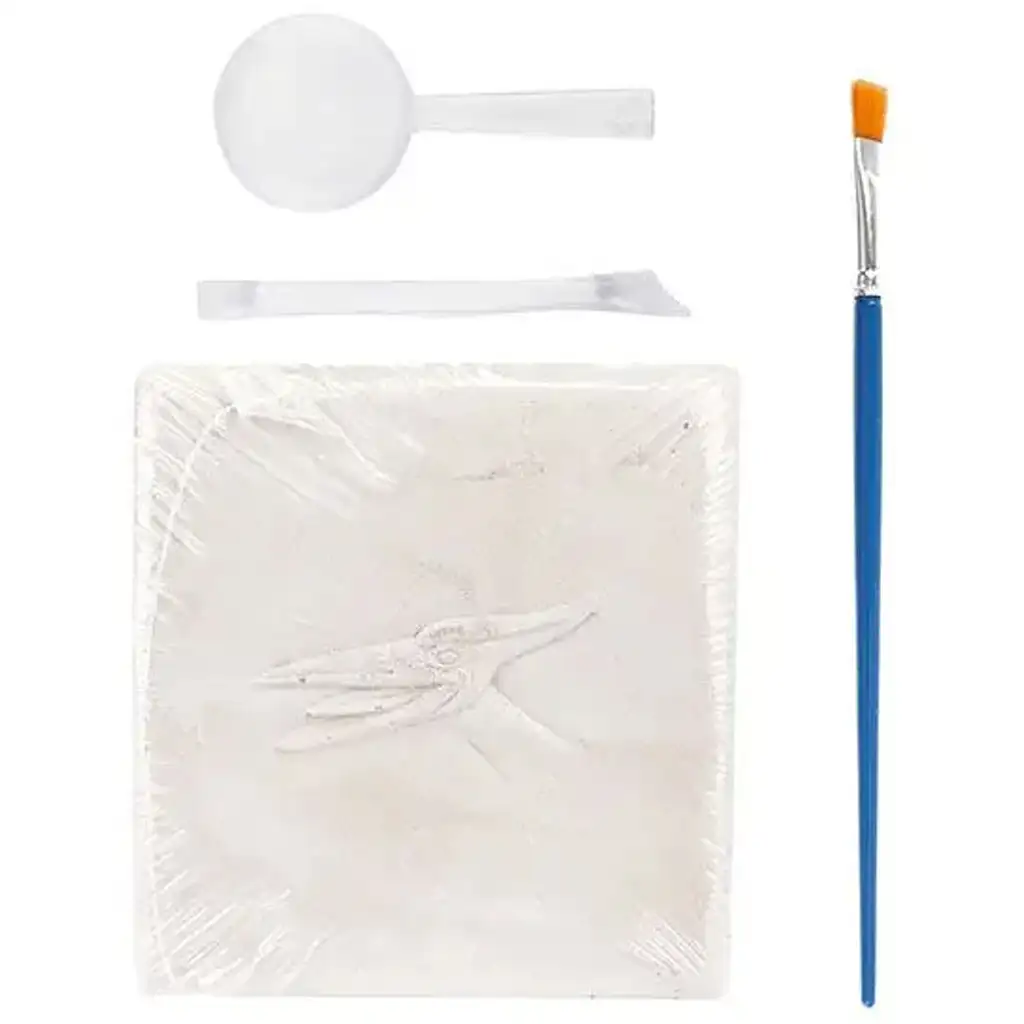 Das Set enthält alle notwendigen Werkzeuge: einen Pinsel, einen Meißel und eine Lupe, mit denen die Kinder Schritt für Schritt die verborgenen Knochen präzise freilegen können. Nach der Ausgrabung können die Teile zu einem 3D-Dinomodell zusammengesetzt werden, das später stolz ins Regal gestellt werden kann. In jedem Set ist ein anderer Dinosaurier versteckt – zum Beispiel Tyrannosaurus Rex, Stegosaurus, Triceratops, Brachiosaurus oder Pteranodon –, sodass jedes Set ein neues Abenteuer bietet!