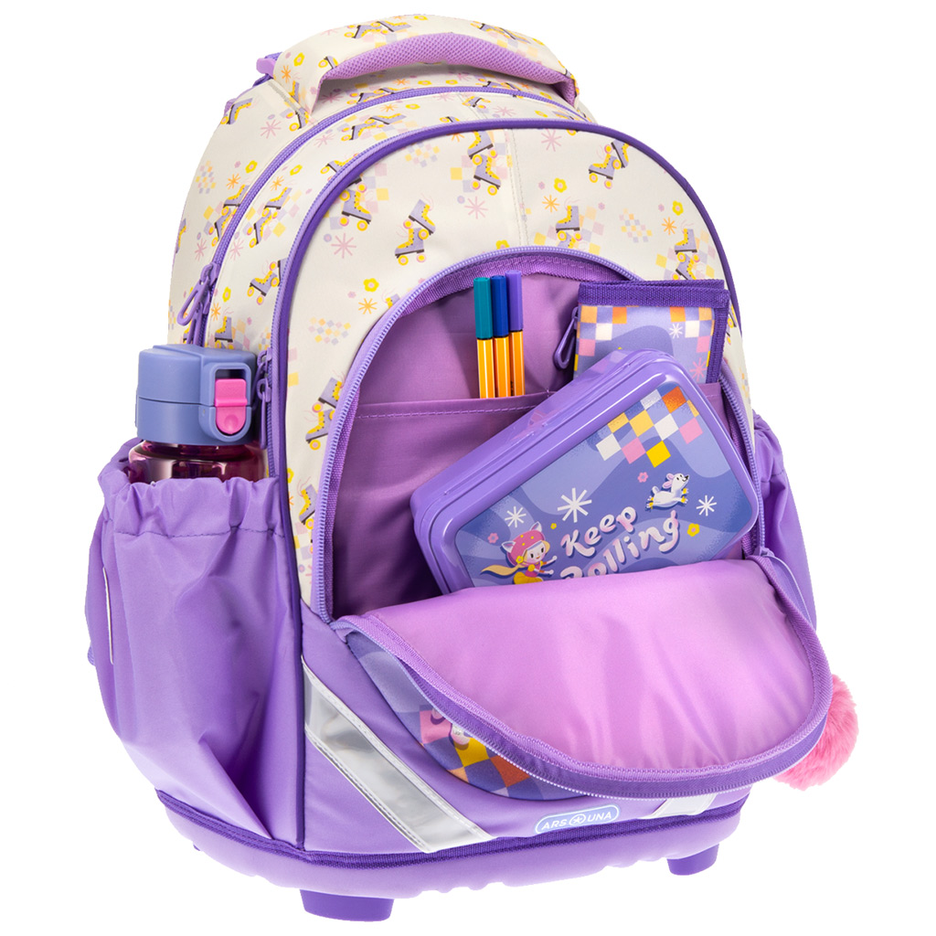 Der anatomisch gestaltete Ars Una Keep Rolling Schulranzen ist die perfekte Wahl, wenn du für dein Kind zur Einschulung eine fröhliche und zugleich praktische Tasche suchst. Der mit Rollschuh-Motiv und pastell-lilanen Farben verzierte Rucksack ist nicht nur stylisch, sondern wurde speziell für die Bedürfnisse von Grundschulkindern entwickelt. Für Schüler/innen der 1. bis 4. Klasse empfohlen und damit ein idealer Begleiter für den Schulalltag.
