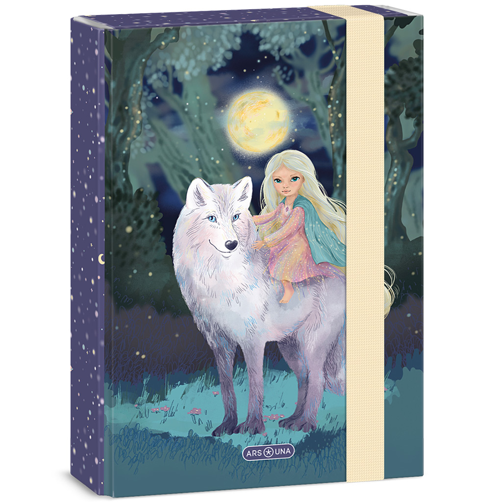 Die Ars Una: Northern Lights Heftbox A/5 ist die perfekte Wahl, wenn dein Kind eine wirklich besondere und praktische Aufbewahrungsmöglichkeit braucht. In der zauberhaften, nächtlichen Waldszene sind ein Mädchen und ein weißer Wolf im Mondlicht zu sehen, was dem Alltag eine märchenhafte Stimmung verleiht. Sie ist nicht nur schön, sondern auch äußerst nützlich: Sie hilft, Hefte, Zeichnungen und wichtige Schulunterlagen zu ordnen. Die strapazierfähige, harte Kartonhülle schützt den Inhalt vor Knicken, während das elastische Gummiband die Heftbox auch in der Tasche sicher geschlossen hält.