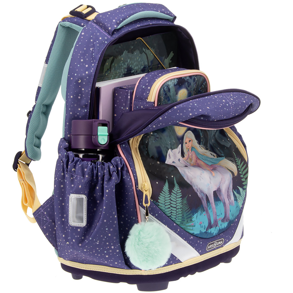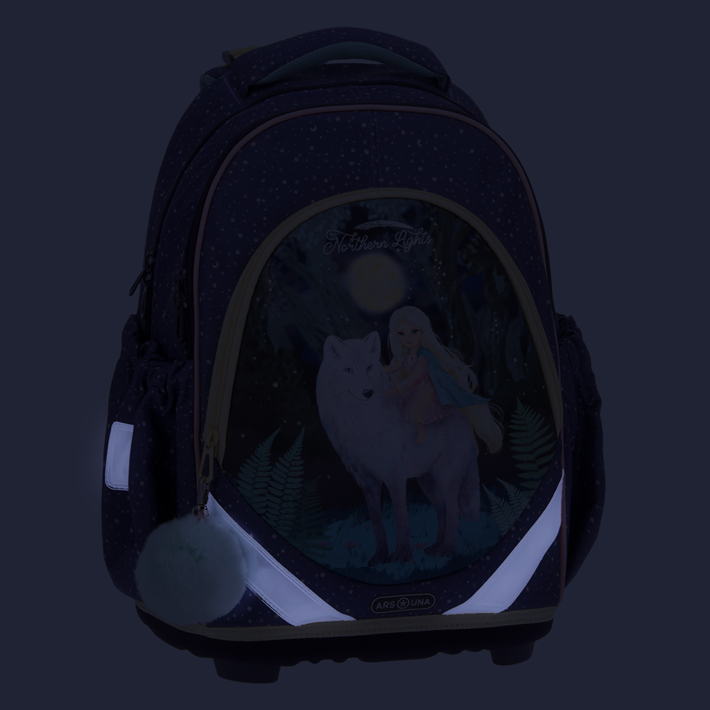 Der Ars Una Northern Lights anatomische Schulranzen ist die perfekte Wahl, wenn du für dein Kind in den ersten Jahren der Grundschule einen leichten, zugleich praktischen und auffälligen Rucksack suchst. Er ist speziell für die 1.–3. Klasse empfohlen und daher optimal auf die Bedürfnisse der Kleineren abgestimmt. Das besondere, märchenhafte Motiv – das im Mondschein stehende Mädchen und der weiße Wolf – verleiht ihm ein wirklich einzigartiges Aussehen, das Kinder lieben werden.
