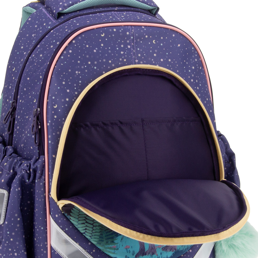 Die praktische Innenaufteilung erleichtert das Organisieren: Er bietet drei große Reißverschlussfächer, von denen das größte ein Textiltrennfach für Bücher und Hefte enthält. Im kleinsten Fach gibt es eine separate Stifte- und Ausweishalterung, sodass kleine Dinge ordentlich verstaut werden können. Die beiden seitlichen Gummitaschen eignen sich ideal für eine Trinkflasche oder kleinere Gegenstände.