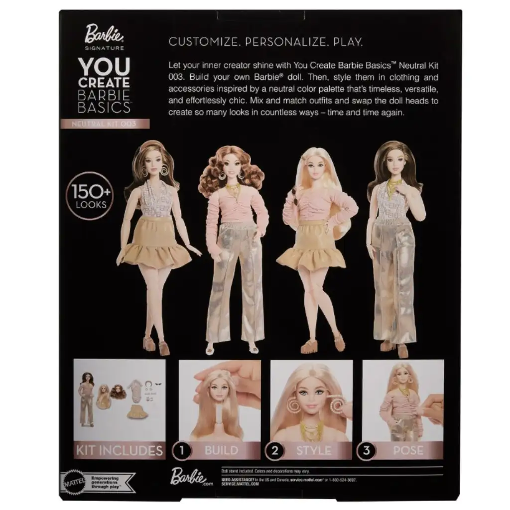 Die Barbie: You Create Puppe ist ein besonderes, kreativitätsbasiertes Spielset, bei dem Kinder (und Sammler) das Aussehen ihrer eigenen Barbie immer wieder neu gestalten können. Dieses hochwertig wirkende Set ist Teil der Barbie Signature Kollektion und stellt die Individualisierbarkeit in den Mittelpunkt. Das Set enthält mehrere austauschbare Elemente, sodass die Frisur, Kleidung und der Stil der Puppe variiert werden können – dadurch sind über 150 verschiedene Looks möglich. Die neutral gehaltene Kleidung und Accessoires sorgen für eine zeitlose, elegante Ausstrahlung und regen gleichzeitig zur Selbstdarstellung und zum Experimentieren mit Mode an. Dank der beweglichen Gelenke kann die Puppe einfach posiert werden, was das Spielen und Ausstellen noch unterhaltsamer macht. Perfekt für alle, die einen einzigartigen Stil, Kreativität und die kreative Seite der Barbie-Welt lieben.