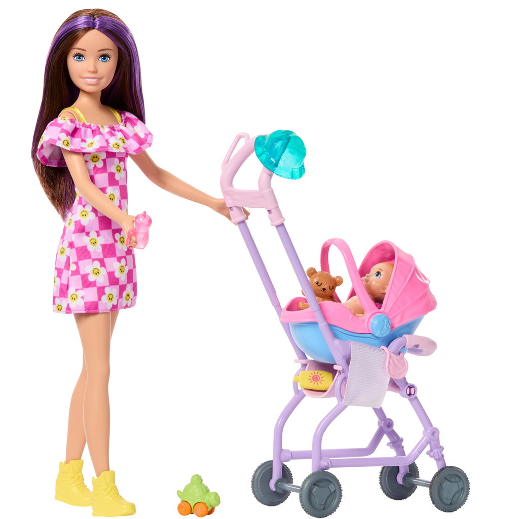 Die Barbie-Puppe im Blumenkleid – das Babysitter-Spielset ist eine ausgezeichnete Wahl, wenn Ihr Kind fürsorgliche Spielsituationen aus dem Alltag nachspielen möchte. Skipper, die Babysitter-Puppe, macht jetzt einen fröhlichen Spaziergang mit dem Baby, sodass im Spiel auf natürliche Weise Fürsorge und Verantwortungsbewusstsein vermittelt werden. Skipper ist in ein hübsches, blumengemustertes Kleid gekleidet und trägt bequeme Sportschuhe, so ist sie bereit für einen ganzen Tag voller Arbeit und Spiel. Zum Set gehört ein Kinderwagen mit herausnehmbarem Tragekorb, der ein 2-in-1-Spielerlebnis bietet, sowie zahlreiche kleine Accessoires wie Spielzeuge, Mütze, Sonnencreme und Trinkbecher. Diese helfen dabei, realistische Geschichten zu erfinden und fördern gleichzeitig die Empathie und Fantasie der Kinder. Ideal als Geschenk ab 3 Jahren, zum alleinigen Spielen oder in Kombination mit anderen Barbie-Sets.
