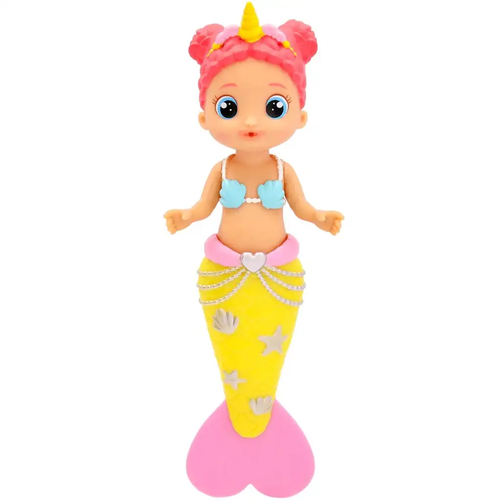 Naomi hat eine hellgelbe Meerjungfrauenflosse und eine rosafarbene Schwanzflosse, die mit Sternen, Muscheln und Perlenketten verziert ist. Die Taille wird von einer herzförmigen Spange betont, während das hellblaue Muscheloberteil einen fröhlichen Kontrast zu den anderen Farben bildet. Ihr süßes Gesicht wird von rosa Haaren und einem gelben Einhornhorn gekrönt, wodurch Naomi zu einer echten Märchenfigur wird – gleichzeitig Meerjungfrau, Prinzessin und Einhorn!