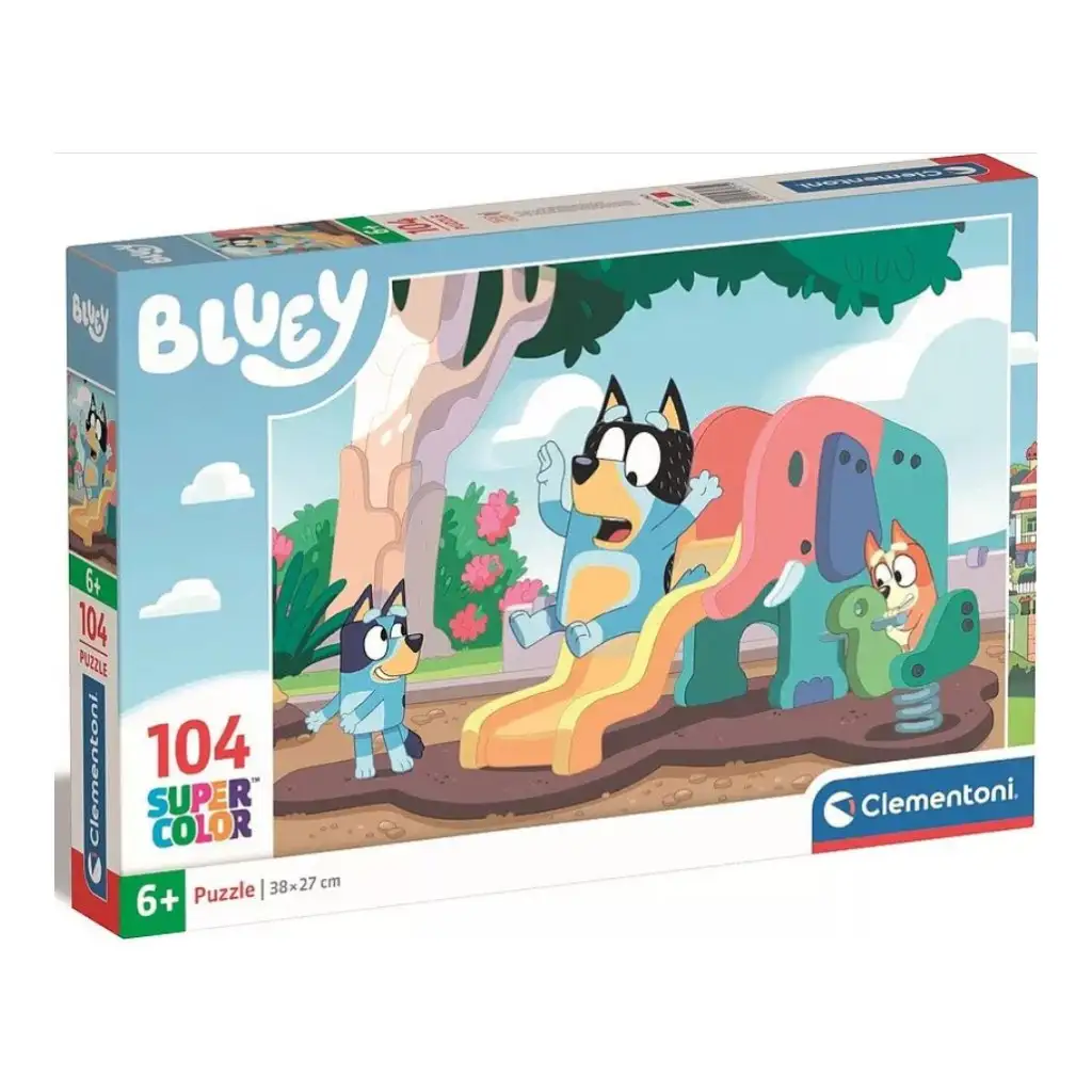 Bluey Hund rutscht 104-teiliges Supercolor Puzzle - ClementoniBluey Hund rutscht 104-teiliges Supercolor Puzzle - Clementoni