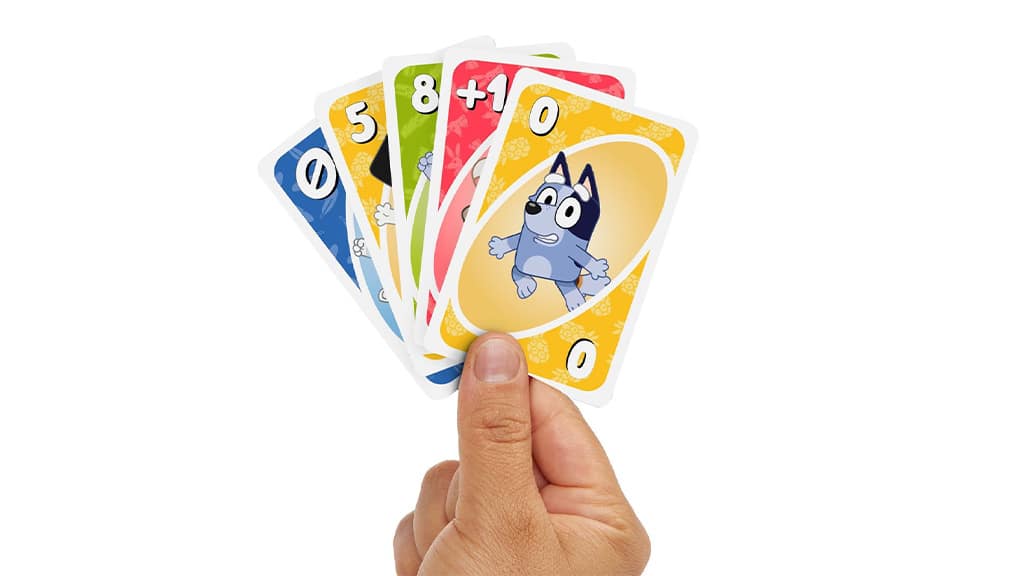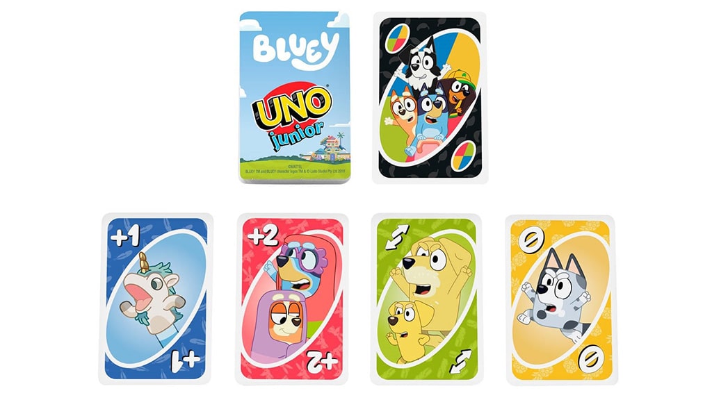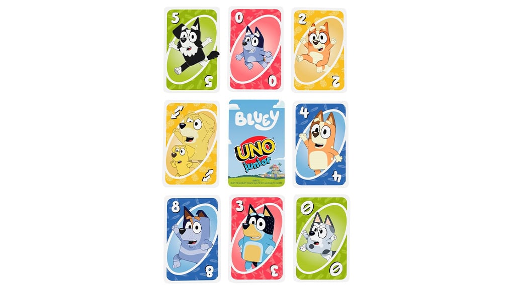 Die farbenfrohen Charaktere aus der Welt von Bluey erscheinen auf jeder einzelnen UNO-Karte. Auf den Zahlen- und Aktionskarten sind beliebte Figuren wie Bluey, Bingo, Bandit, Chili und Muffin zu finden. Das Kartenset enthält außerdem von Fans geliebte Momente wie die „Grannies“- und Unicorse-Szenen. Diese besonderen Karten machen das Spiel noch spannender und unterhaltsamer, während Kinder und Familienmitglieder gemeinsam die magische Welt der Bluey-Serie erleben können.