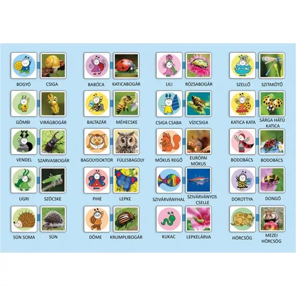 Entwicklung und Spaß gehen Hand in Hand – entdecke die Welt von Bogyó und Babóca mit diesem fröhlichen Memory-Spiel! Das „Wer ist wer?“-Memory macht nicht nur den Kleinsten großen Spaß, sondern fördert auch Beobachtungsgabe, Konzentration und Gedächtnis. Die beliebten Charaktere – Bogyó, Babóca, Baltazár, Pihe und die anderen – werden in diesem Spiel echten Tieren zugeordnet, sodass dabei auch gelernt werden kann: Zu wem gehört der Marienkäfer, die Biene, die Schnecke oder die Eule?