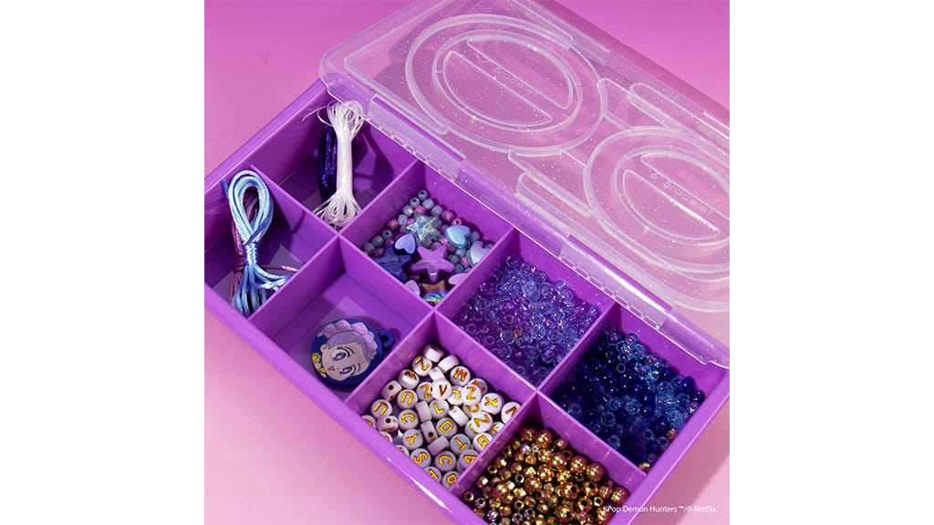 Wenn du einen wirklich coolen Stil möchtest, hol dir das K-pop Dämonenjäger Freundschaftsarmband-Set! Kleine Fans können aus drei Sets wählen – Rumi , Mira oder Zoey – und sie können ihre eigenen, glänzenden Accessoires mit bunten Stern-, Herz- und Buchstabenperlen sowie einem niedlichen Charakter-Anhänger gestalten.