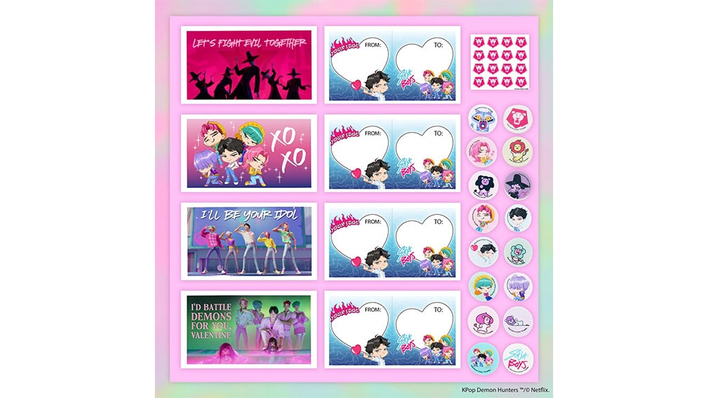 Dieses Jahr am Valentinstag können Kinder ihre Begeisterung für ihre Lieblingsbands mit Grußkarten zum Thema K-Pop Dämonenjäger teilen. Diese Sets sind in zwei verschiedenen Stilen, HUNTR/X und Saja Boys, erhältlich und enthalten 16 faltbare Valentinskarten mit liebevollen Botschaften, die perfekt für kleine Fans sind.