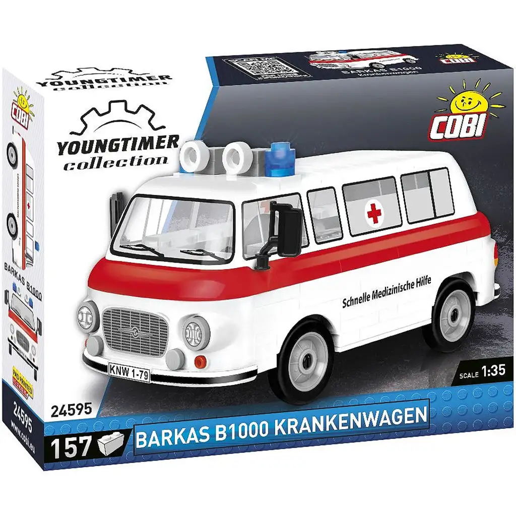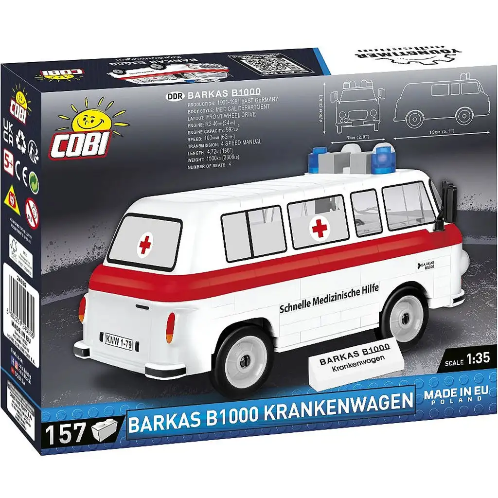 Das COBI Barkas B1000 Krankenwagen-Bauset erweckt eines der ikonischen Fahrzeuge der ostdeutschen Automobilindustrie mit Bausteinen zum Leben. Das Modell im Maßstab 1:35 besteht aus 157 hochwertigen Teilen, die die klassische Form und Details der Rettungswagen-Version des Barkas B1000 originalgetreu wiedergeben. Ein besonderes Merkmal des Sets sind die bedruckten Grafikelemente – es gibt keine aufklebbaren, abnutzungsgefährdeten Sticker. Das Fahrzeug verfügt über funktionsfähige Räder, die echtes Fahrvergnügen ermöglichen, sodass es nicht nur als Ausstellungsstück, sondern auch beim aktiven Spiel überzeugt.