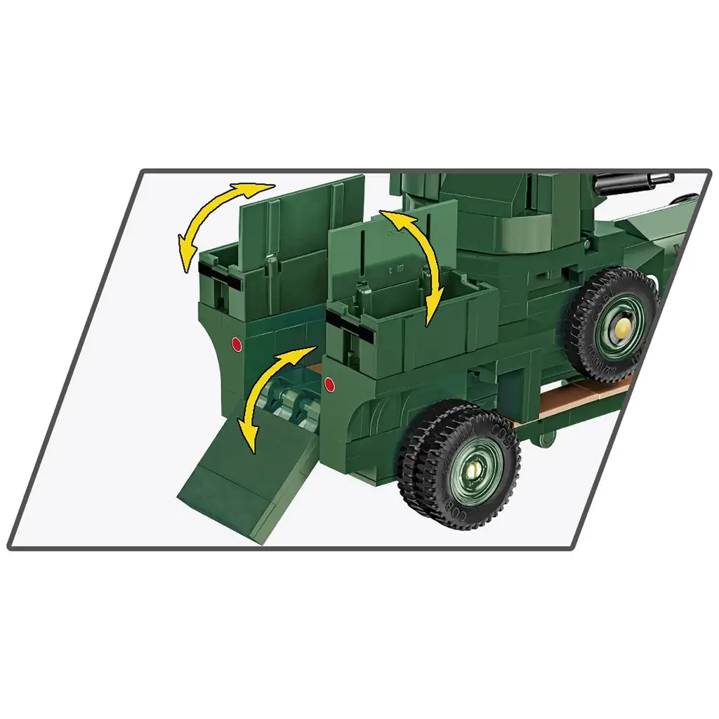 Der Bausatz besticht durch seine detailreiche Ausführung: ein drehbarer Turm mit beweglichem Maschinengewehr, zu öffnende Türen und ein realistischer Aufbau machen das Modell besonders. Dank der langlebigen, abriebfesten Drucke behält das Modell sein ursprüngliches Aussehen auch ohne Aufkleber über lange Zeit. Das Set enthält außerdem eine britische Soldatenfigur, was das Spielen mit dem Fahrzeug noch spannender macht. Eine klare, bebilderte Anleitung erleichtert die Montage, sodass der Bauprozess für alle Altersgruppen ein Vergnügen ist.