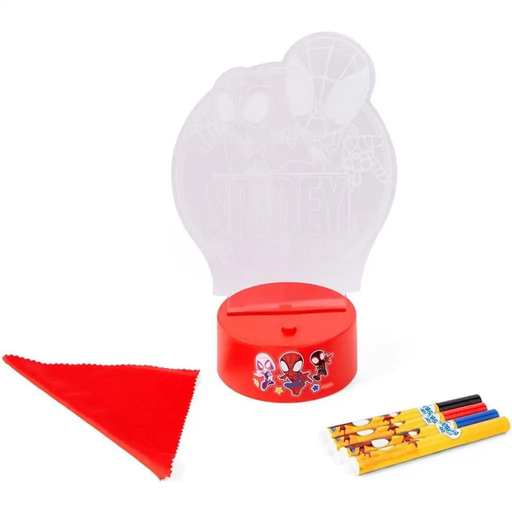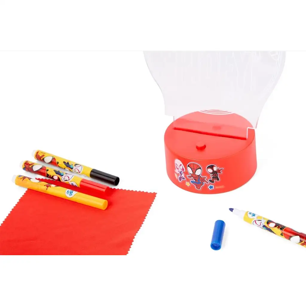Das Set enthält einen LED-Lampensockel, eine transparente, mit Spidey und seinen Freunden verzierte Leuchtplatte sowie 4 leuchtende Filzstifte, mit denen Kinder das Muster nach Belieben ausmalen können. Wenn das Kunstwerk fertig ist, erweckt die LED-Beleuchtung die Zeichnungen zum Leben – so wird daraus nicht nur ein unterhaltsames Bastelprojekt, sondern auch eine praktische, beruhigende Lichtquelle für die Nacht. Die Lampe verfügt über drei verschiedene Helligkeitsstufen und kann damit perfekt an die Atmosphäre des Zimmers und die Schlafgewohnheiten angepasst werden.