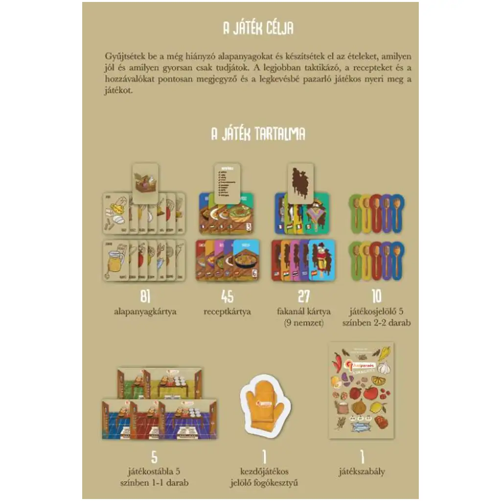 Das Besondere an Chefparade ist, dass es nicht nur unterhält, sondern auch das logische Denken der Kinder fördert, ihre Konzentration stärkt und sie spielerisch an eine gesunde Ernährung heranführt. Die eindrucksvollen Illustrationen und farbenfrohen Spielkomponenten machen das Spiel noch unterhaltsamer. Außerdem ist jedes einzelne Element eine sorgfältige, liebevoll gestaltete ungarische Entwicklung.