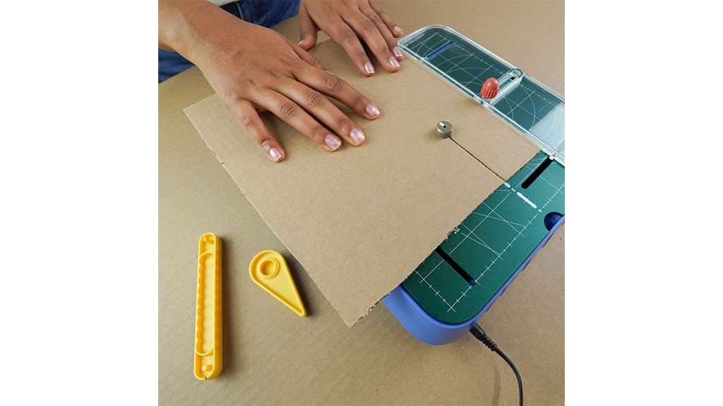 Dieses All-in-One-Kartonwerkzeug-Set enthält das ChompSaw , ein für Kinder sicheres Elektrowerkzeug, das zum Schneiden von Karton geeignet ist. Im Set sind außerdem Zubehörteile wie ein Zirkelwerkzeug, ein Lineal, ein Winkelmesser sowie ein Arbeitsheft enthalten.