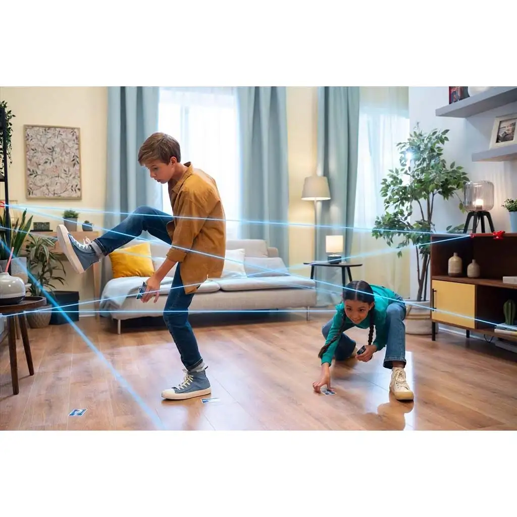 Der Aufbau des Spielfelds ist einfach und flexibel – die Schnüre können frei an beliebigen Möbelstücken oder Flächen befestigt werden, sodass bei jedem Spiel eine neue Bahn entsteht. Der Countdown und die Bewegungssensoren sorgen für Spannung: Berührt jemand den „Laser“, beginnt die Bombe schneller zu ticken! Ziel des Spiels ist es, das Kontrollpanel zu erreichen und rechtzeitig den Countdown zu stoppen. Du kannst dich alleine herausfordern oder im Team spielen, sodass die Mission zu einer echten Teamarbeit wird.