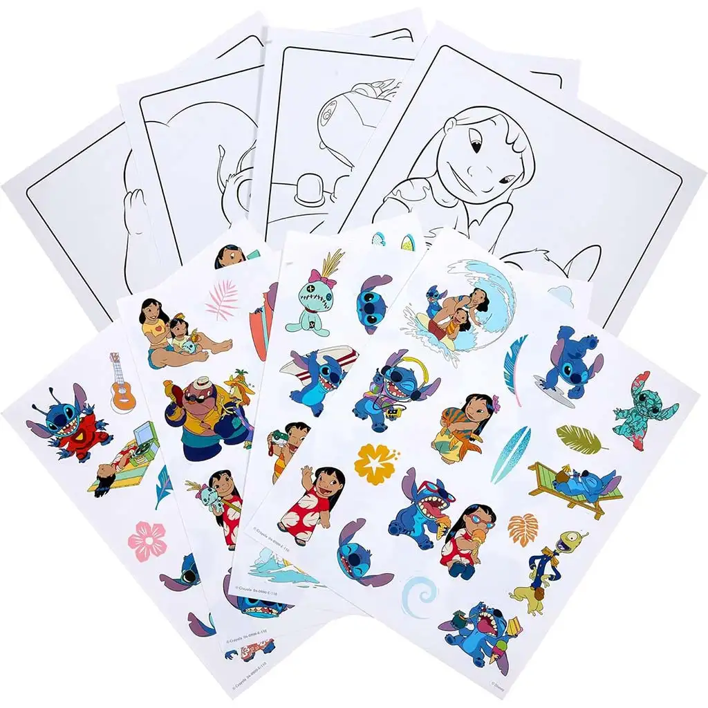 Auf den vier farbigen Stickertafeln finden sich beliebte Szenen und Figuren wie Stitch auf dem Surfbrett, Lilos Umarmung oder der freche Außerirdische in Aktion. Die Sticker lassen sich leicht ablösen und wieder aufkleben, sodass Kinder beim Spielen immer wieder neue Szenen erschaffen können. Die einfachen Linien der Ausmalbilder eignen sich perfekt schon ab 3 Jahren – auch für selbstständiges Malen.
