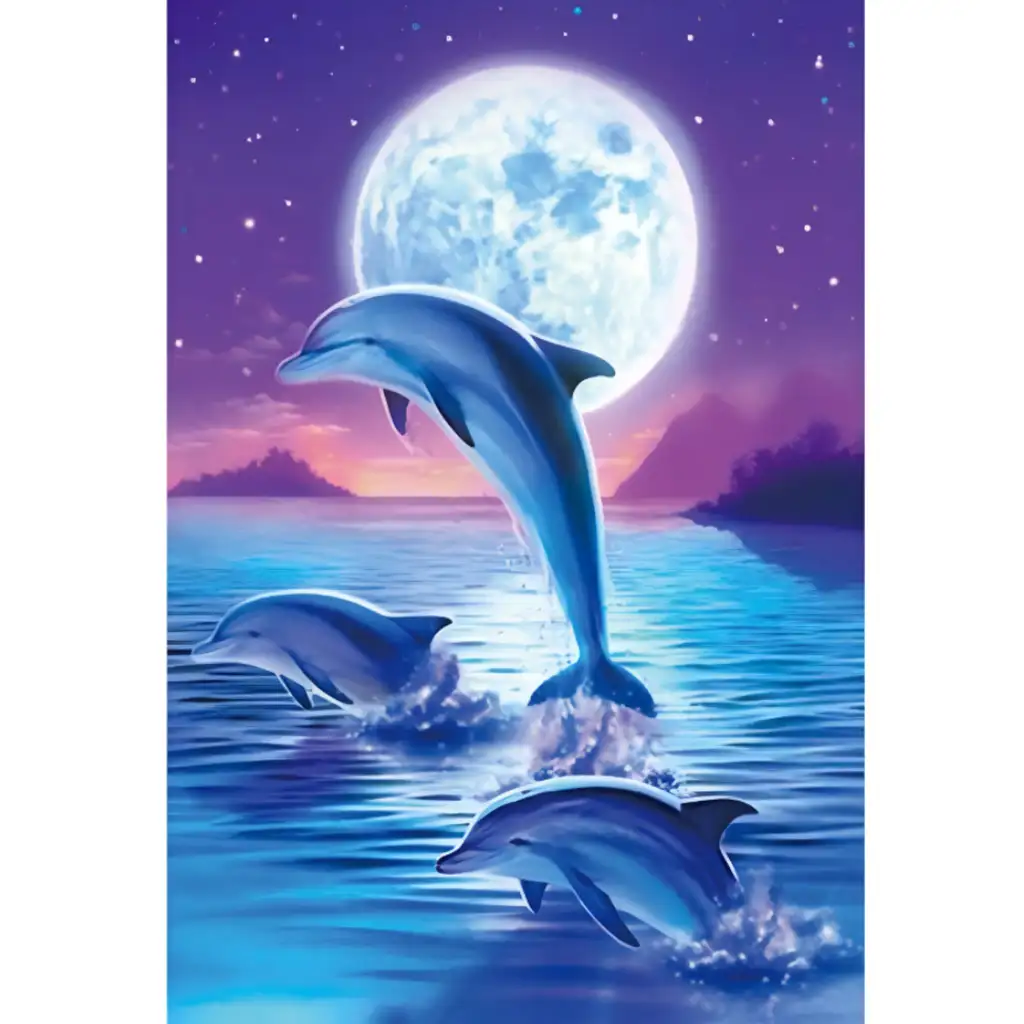 Das Delfin-Diamantmalset zeigt eine magische, mondbeschienene Meereslandschaft, in der drei Delfine fröhlich im Wasser springen, während der Vollmond und der sternenklare Himmel im Hintergrund eine romantische Stimmung zaubern. Dieses 10x15 cm große Diamantmosaik ist sowohl für Anfänger als auch für Fortgeschrittene eine ausgezeichnete Wahl, da es dank seiner kleineren Größe schnellen Erfolg bietet und dennoch ein beeindruckendes und besonderes Bild ergibt. Die Arbeit mit den kleinen, funkelnden Diamanten ist nicht nur unterhaltsam, sondern hilft auch, die Geschicklichkeit, Konzentration und Geduld zu fördern.