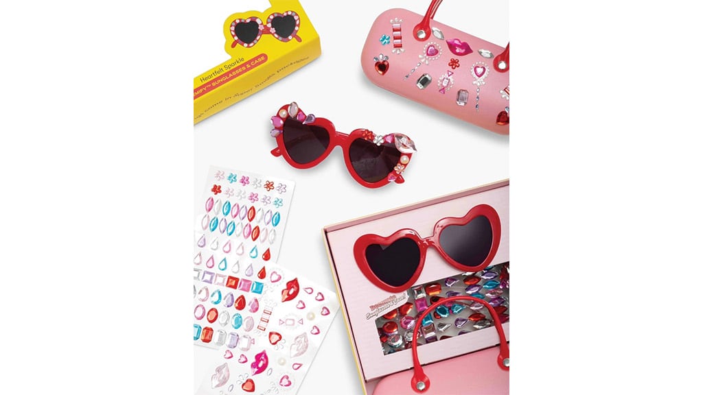 Dieses Set ist zugleich eine kreative Bastelaktivität und ein glitzerndes, modisches Accessoire. Die Kinder können die rote, herzförmige Sonnenbrille mit UVA/UVB-Schutz sowie die rosa Tragetasche nach ihrem eigenen Geschmack dekorieren. Das Paket enthält mehr als 100 funkelnde Edelstein-Sticker in Herz-, Lippen- und Bonbonform, sodass jeder seine eigene Brille und Tasche wirklich einzigartig gestalten kann.