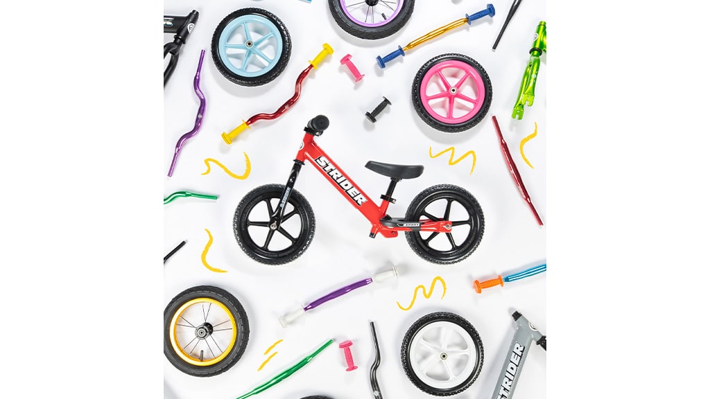 Erstelle deine eigene Version des Strider 12 Sport Bike oder des Strider 12 Pro Bike Modells – ausschließlich in den auf der Webseite verfügbaren, einzigartigen Farben und mit fröhlichem Zubehör! Du kannst die Rahmenfarbe, den Stil und die Farbe der Räder, den Stil und die Farbe des Lenkers individuell gestalten und verschiedene Accessoires hinzufügen, damit dein Laufrad wirklich einzigartig wird. Entdecke die Möglichkeiten und gestalte das perfekte Laufrad für dein Kind!