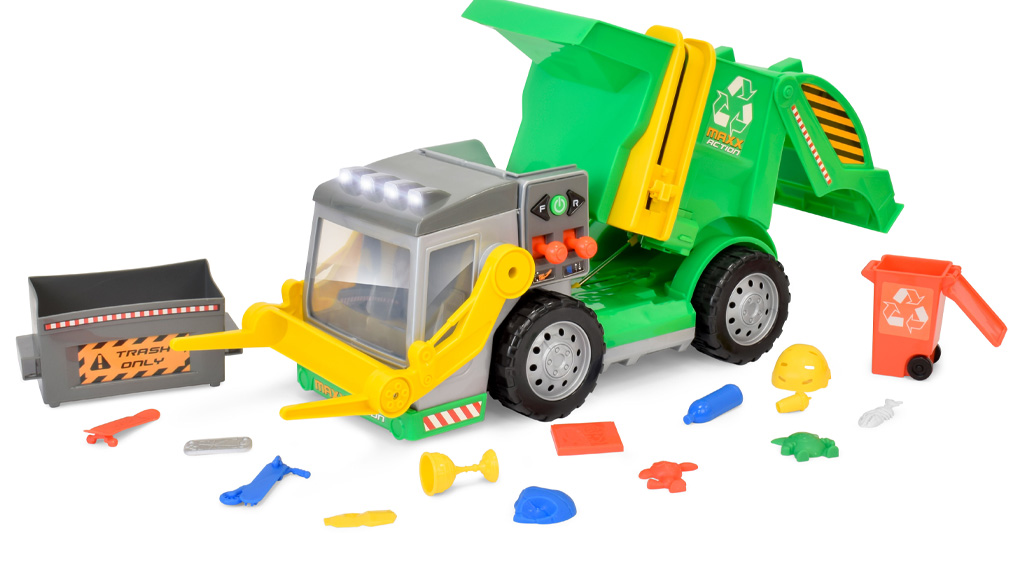Kinder können das Fahrzeug mit den zwei Joystick-Steuerungen lenken und die 15 mitgelieferten Müllstücke einsammeln. Der vordere Lader hebt den Müll an und kippt ihn auf die Ladefläche des Lastwagens, die abnehmbare Mülltonne kann auf- und abbewegt werden, und die hintere Tür lässt sich öffnen, um den Müll zu entleeren. Die Kinder können den Lastwagen vorwärts und rückwärts bewegen, was das Spiel noch spannender macht, während sie ihre Feinmotorik und Koordination entwickeln.Zwei Spiele in einem! Der Baggerlader verfügt über eine bewegliche Frontschaufel und einen Baggerarm. Das lange Transportfahrzeug macht das Spiel mit Geräuscheffekten und Lichtern noch spannender. Wenn die Bauarbeiten beendet sind, können die Kinder den Baggerlader auf die Rückseite des langen Transportfahrzeugs laden, so können sie ihn einfach lagern oder transportieren. Dieses Spielzeug fördert die Fantasie, regt das Rollenspiel an und unterhält die Kinder stundenlang!