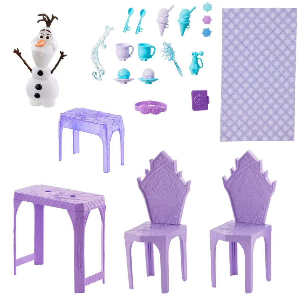 Das Spielset enthält mehr als 20 Zubehörteile, darunter Tisch, Stühle, Decke, Eiscreme und heiße Schokolade – so sind der Fantasie beim Rollenspiel keine Grenzen gesetzt. Elsa- und Anna-Puppen (separat erhältlich) lassen sich spielend leicht in die Geschichte einfügen, sodass die Schwestern gemeinsam jedes Abenteuer erleben können. Das gesamte Schlossdesign und die Farbwelt spiegeln das Frozen-Universum originalgetreu wider – mit eisblauen, lilafarbenen und glitzernden Details.
