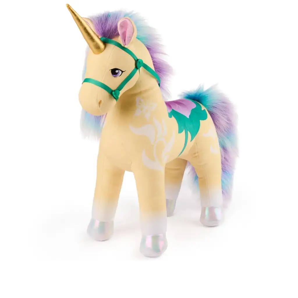 Magische Abenteuer erwarten dich mit Leaf, einem der außergewöhnlichsten Bewohner der zauberhaften Einhorn Akademie! Dieses 38 cm große, kuschelweiche Plüsch-Einhorn regt nicht nur die Fantasie der Kinder an, sondern erobert auch im Handumdrehen ihre Herzen. Das bezaubernde Einhorn mit goldenem Horn zaubert mit seinem fröhlichen Farbenspiel – einem pastellgelben Körper, glitzernden Hufen sowie einer lila-blauen Mähne und Schweif – eine echte Märchenatmosphäre ins Kinderzimmer.