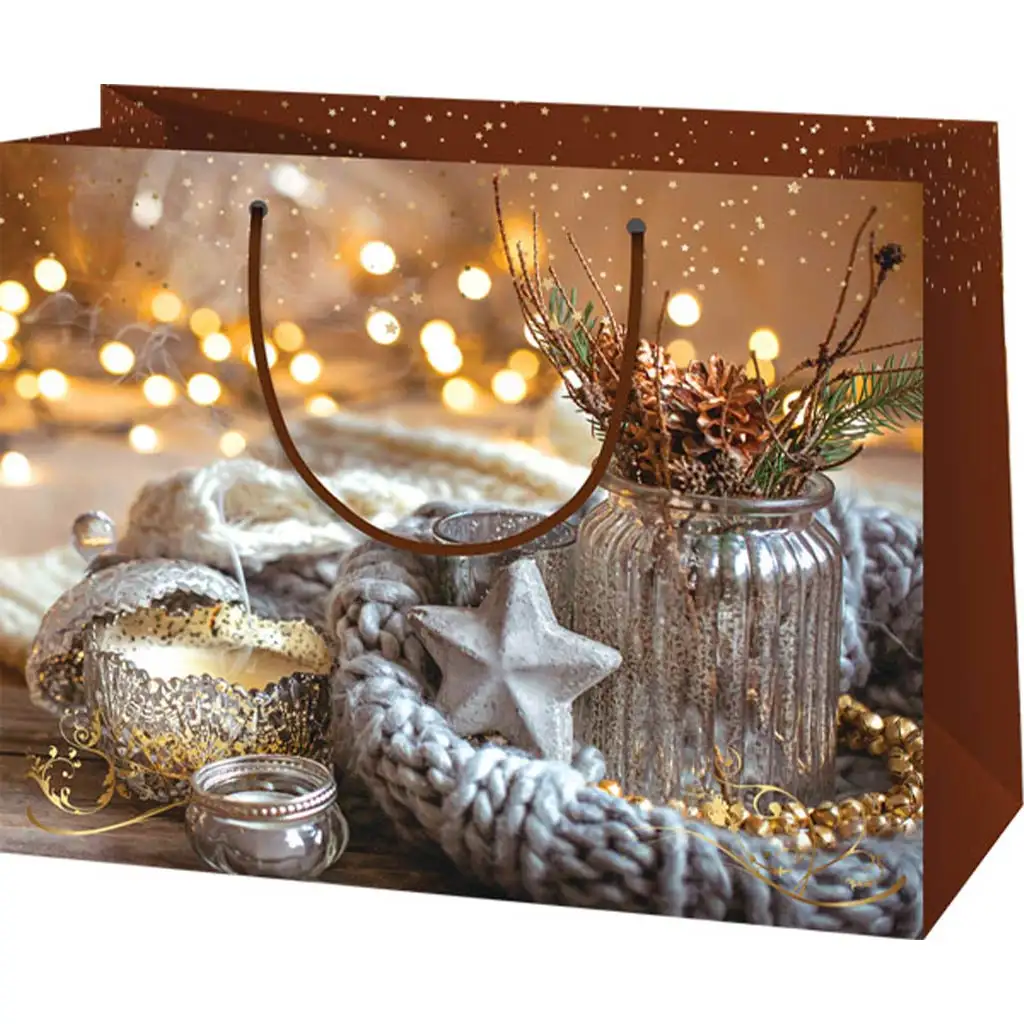 Diese große Geschenktasche erinnert an den Geist und Zauber der Festzeit. Die Tasche mit weihnachtlicher Dekoration, in der die festlichen Lichter und die magischen Elemente von Weihnachten erscheinen, weckt garantiert die Wärme der Dezembermonate und die Aufregung der festlichen Vorbereitungen. Die Tasche mit den Maßen 27x14x33 cm bietet reichlich Platz für Geschenke, sei es ein Buch, Spielzeug oder ein besonderes Kleidungsstück. Die starken Kordelgriffe sorgen für einen bequemen Halt, sodass die Geschenktasche auch mit schwereren Geschenken leicht und sicher transportiert werden kann. Der verstärkte Boden sorgt dafür, dass die Tasche ihre Form behält und die Geschenke stabil darin stehen. Das glänzende laminierte Papier, aus dem sie besteht, verleiht der Tasche nicht nur Strapazierfähigkeit, sondern auch ein äußerst elegantes Aussehen, sodass die Tasche mit dem Geschenk selbst unvergesslich wird.