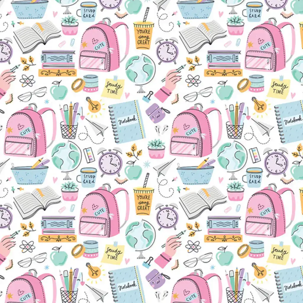 Dieses fröhliche und inspirierende Geschenkpapier ist die perfekte Wahl für jedes schulpflichtige Kind! Das Papier im Format 100x70 cm ist voll von liebevollen, lernbezogenen Motiven, die garantiert sowohl kleinen als auch größeren Kindern ein Lächeln ins Gesicht zaubern. Rosa Rucksäcke, Notizbücher, Bleistifte, Globen, Uhren und motivierende Botschaften – wie „Study Time“ und „You’re Doing Great“ – regen die Kinder dazu an, mit Begeisterung zu lernen.
