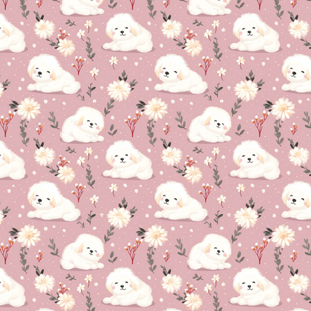 Motiv: weiße kleine Hündchen mit Blumen auf rosafarbenem Hintergrund