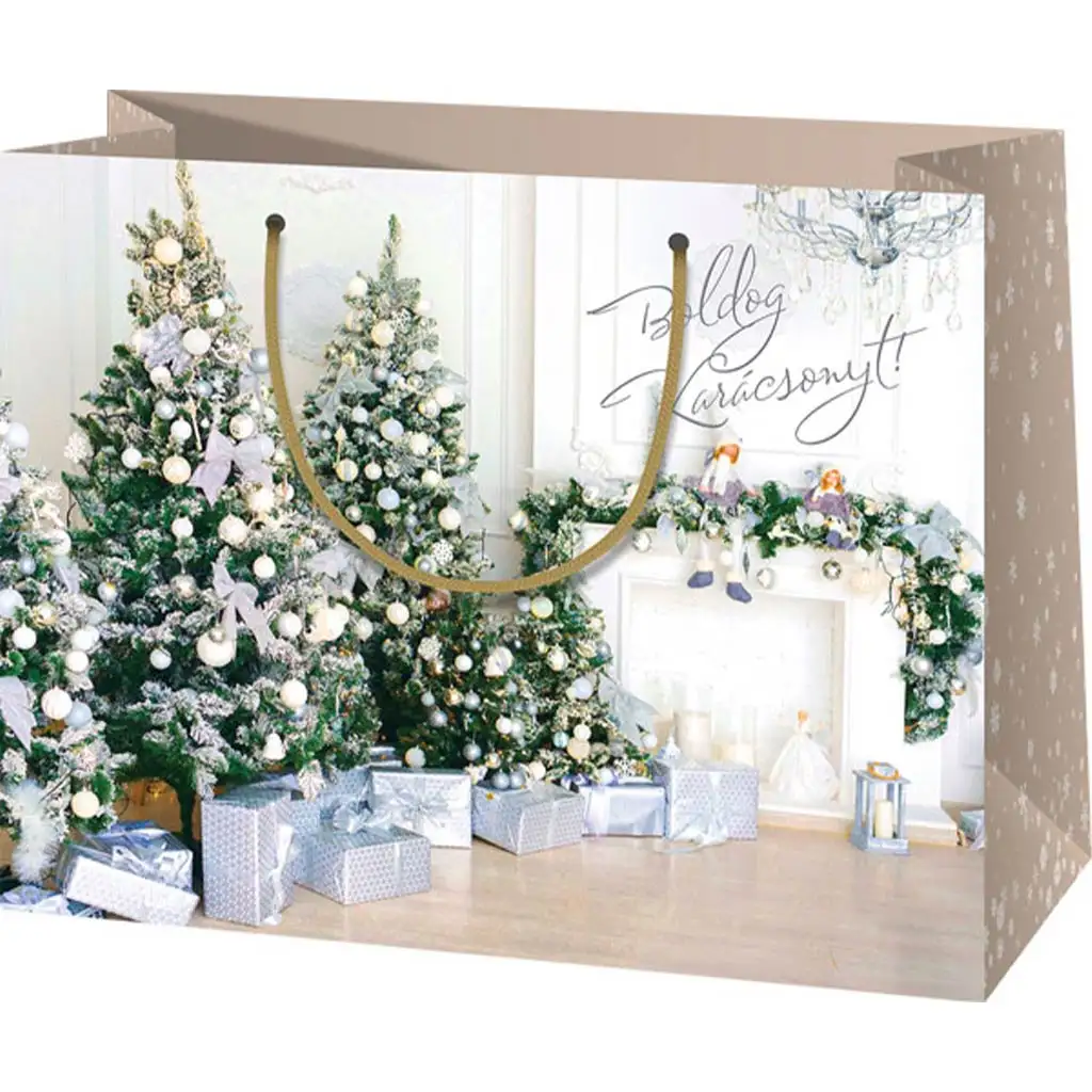 Diese große Geschenktasche wurde im Geiste der Weihnachtszeit hergestellt und bringt bei jeder Gelegenheit den Zauber des Schenkens mit sich. Die Oberfläche der Tasche ist mit fröhlichen Weihnachtsbäumen und funkelnden Geschenken verziert, die die festliche Freude und Erwartung widerspiegeln. Mit einer Größe von 27x14x33 cm ist sie die ideale Wahl für größere Geschenke, sodass Sie sicher sein können, dass alles hineinpasst. Die starken Kordelgriffe ermöglichen es, auch schwerere Geschenke leicht und sicher zu transportieren. Der verstärkte Boden sorgt für die Stabilität der Tasche, egal wo sie platziert wird. Das glänzende, laminierte Papiermaterial verleiht der Tasche nicht nur eine lange Lebensdauer und Haltbarkeit, sondern auch ein luxuriöses, hochwertiges Aussehen. Wenn Sie ein wirklich unvergessliches Schenkerlebnis bieten möchten, ist diese Geschenktasche die perfekte Wahl!