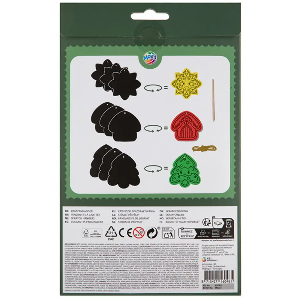 Das Set enthält 9 vorgestanzte schwarze Anhänger (in Form von Schneeflocken, Weihnachtsbaumhäuschen und Weihnachtsbäumen) sowie einen Holzstab, mit dem die Kinder ganz einfach die farbenfrohen Muster auf die Anhänger zaubern können. Einfach die schwarze Oberfläche ankratzen und die regenbogenfarbene Schicht darunter erscheint – so entstehen originelle, glitzernde und festliche Muster. Die fertigen Anhänger lassen sich dann ganz einfach an den Weihnachtsbaum, ins Fenster oder sogar an Geschenke hängen.