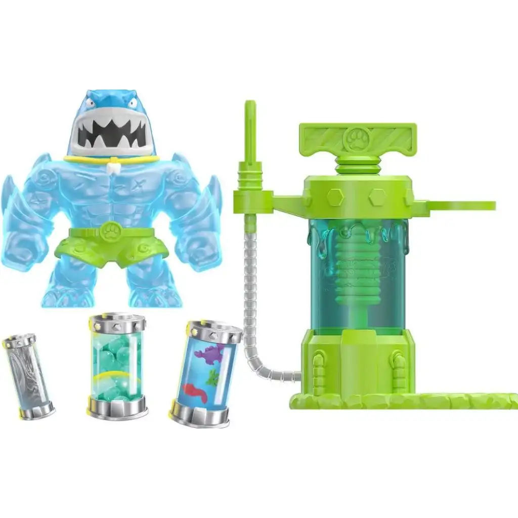 Das Heroes of Goo Jit Zu Do-it-yourself Stretch-Figur - Thrash Set bietet Kindern die Möglichkeit, ihre eigenen dehnbaren Goo Jit Zu Helden zu kreieren. Thrash, der Hai-Held, ist jetzt vollständig anpassbar: Mit den speziellen Gel-Füllungen im Set kannst du die Figur füllen und durch Mischen verschiedene einzigartige Kombinationen erstellen. Das Set enthält drei einzigartige Gel-Füllungen, die du mit dem mitgelieferten Misch- und Füllwerkzeug in Thrashs Körper einfüllen kannst.