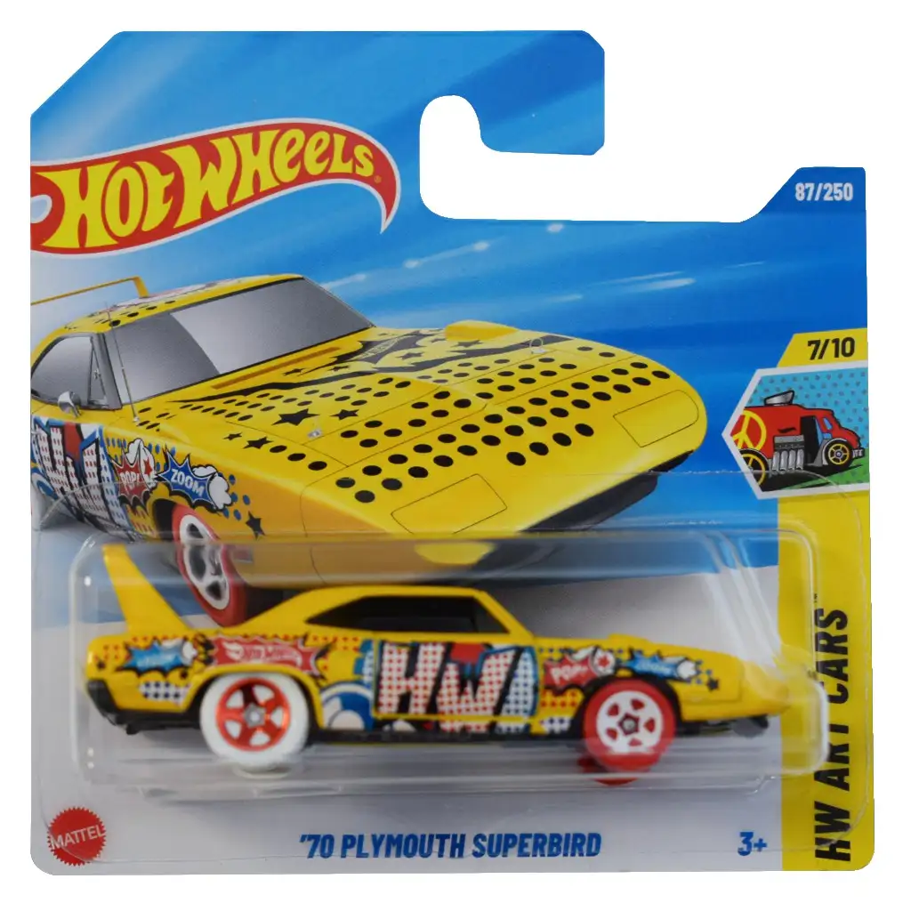 Der Hot Wheels 70 Plymouth Superbird ist ein ikonischer Klassiker, der durch sein pop-artiges Design wirklich besonders wird! Dieses Auto mit gelber Karosserie ist mit lebhaften, comicartigen Grafiken verziert, voll von Pop-, Zoom- und „Pow“-Schriftzügen, die sofort Aufmerksamkeit erregen. Die charakteristische lange Nase und der riesige Heckflügel des Superbird erinnern an den Stil legendärer amerikanischer Muscle-Cars. Als Teil der HW Art Cars Serie ist dieses Modellauto nicht nur ein unterhaltsames Spielzeug, sondern auch ein bemerkenswertes Sammlerstück. Lass dein Kind die Begegnung von Geschwindigkeit und Kunst mit diesem spektakulären Fahrzeug entdecken!