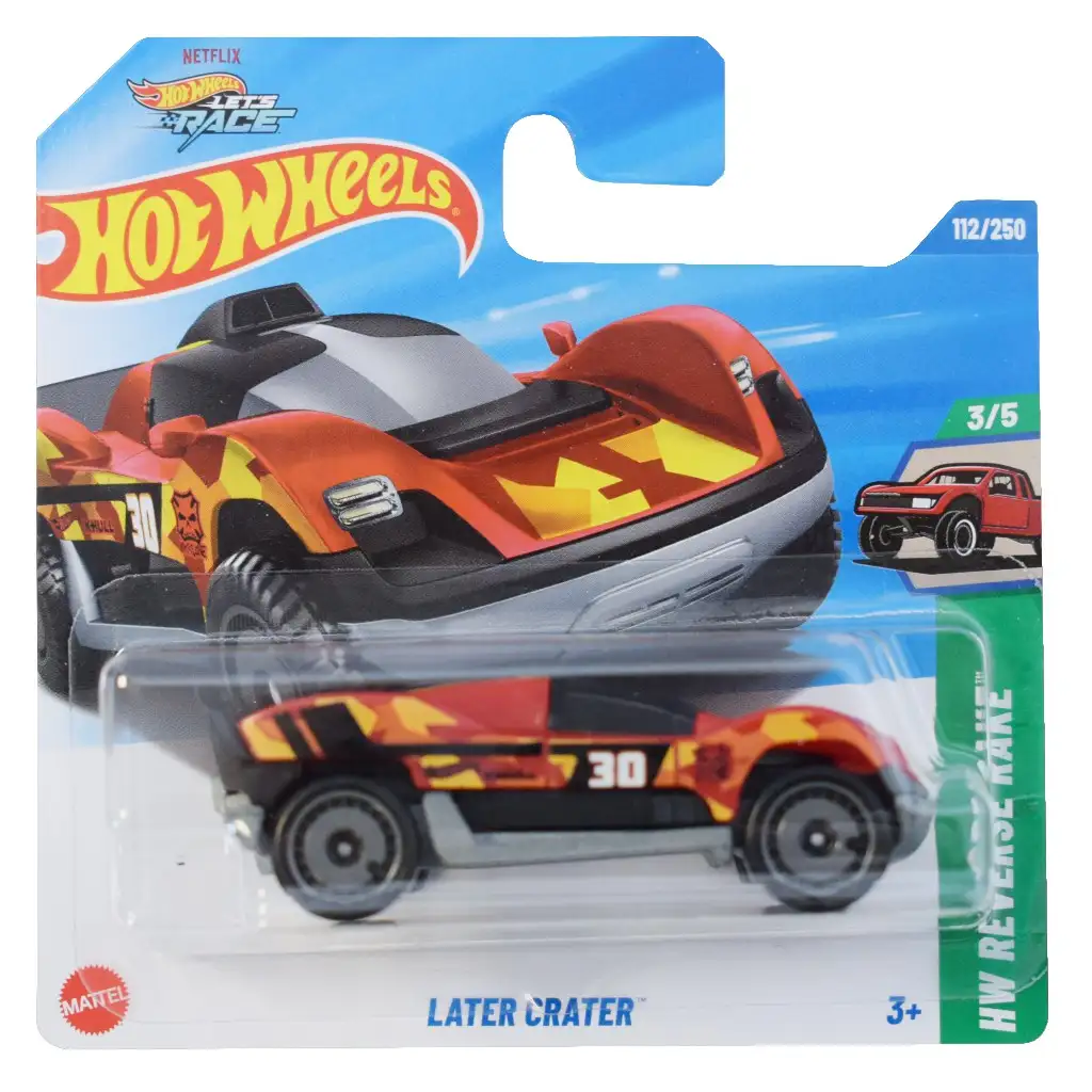 Der Hot Wheels Later Crater ist ein cooler, für das Gelände geborener Wagen, der Kinder und Sammler garantiert beeindrucken wird! Das lebendige rote und orange Flammendesign ist wirklich auffällig, während die robuste Bauweise und die Geländereifen ihn perfekt für die extremsten Abenteuer machen. Die Startnummer 30 und die dynamischen Grafikelemente betonen den Rennwagenstil. Als Teil der HW Reverse Rake Serie ist dieses Fahrzeug ideal für Fans von Geschwindigkeit und Offroad-Herausforderungen und glänzt als besonderes Stück in jeder Sammlung.