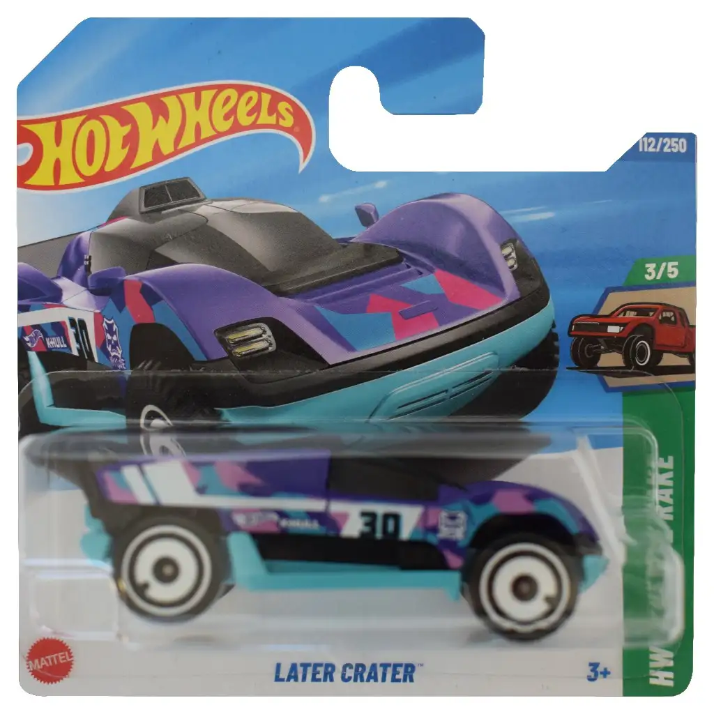 Der Hot Wheels Later Crater ist ein echt cooler und futuristischer Geländewagen im Kleinformat, der sowohl für kleine Rennfahrer als auch für Sammler die perfekte Wahl ist. Dieses Modell ist im Maßstab 1:64 gefertigt und sticht durch seine besondere Kombination aus Lila, Türkis und Schwarz sowie auffälligen geometrischen Mustern hervor. Das kraftvolle Design und die spannenden Details machen den Later Crater zu einer echten Besonderheit in der Hot Wheels Kollektion.