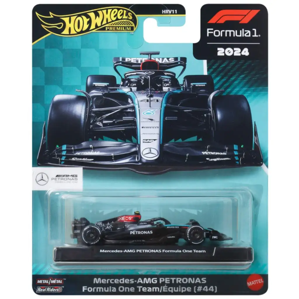 Das exklusive Stück der Hot Wheels Premium Serie ist das Modell des Mercedes-AMG PETRONAS Formula 1 Team Nr. 44, das eines der bekanntesten Rennfahrzeuge der Formel-1-Saison 2024 repräsentiert. Das ikonische schwarz-türkisfarbene Teamdesign, die detaillierten Sponsoren-Grafiken und die präzise ausgearbeiteten aerodynamischen Elemente spiegeln die technische Raffinesse und den Wettkampfgeist der Mercedes F1-Fahrzeuge originalgetreu wider. Das Modell greift in jedem Detail die Proportionen und den Charakter des echten Rennwagens auf.