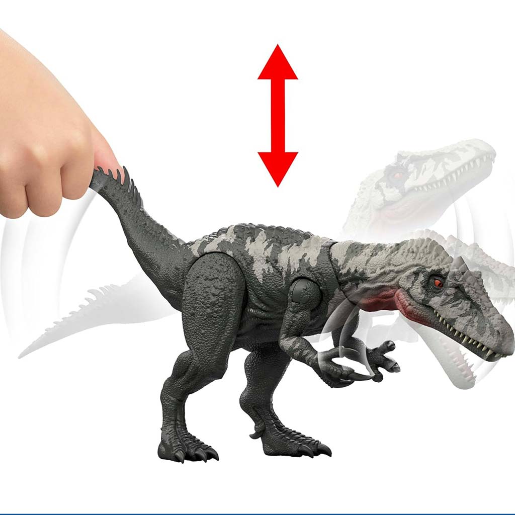 Der Chilantaisaurus ist massiv gestaltet, hat einen kräftigen Körperbau und beeindruckt schon beim ersten Anblick. Die dunkle, naturgetreue Farbgebung und die strukturierte Hautoberfläche machen ihn besonders lebensecht, sodass man sich beim Spielen leicht in die spannende Welt von Jurassic World hineinversetzen kann. Das Highlight der Figur ist die riesige Angreifer-Funktion, die durch das Bewegen des Schwanzes oder des Körpers aktiviert wird: Der Dino führt eine spektakuläre Angriffsbewegung aus und gibt dabei furchterregende Geräusche von sich – so wird das Spielerlebnis noch intensiver.