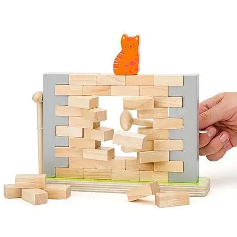 Das Spiel "Katze auf der Mauer" trägt erheblich zur Entwicklung der Fähigkeiten Ihres Kindes bei, da während des Spielverlaufs Geschicklichkeit, Bewegungskoordination und Logik stark gefordert werden. Bei diesem spannenden Spiel müssen die Holzbausteine unter der Katze so herausgeschlagen werden, dass die Katze möglichst lange oben bleibt. Am Ende des Spiels verliert derjenige, bei dem die Katze vom Bauwerk fällt.