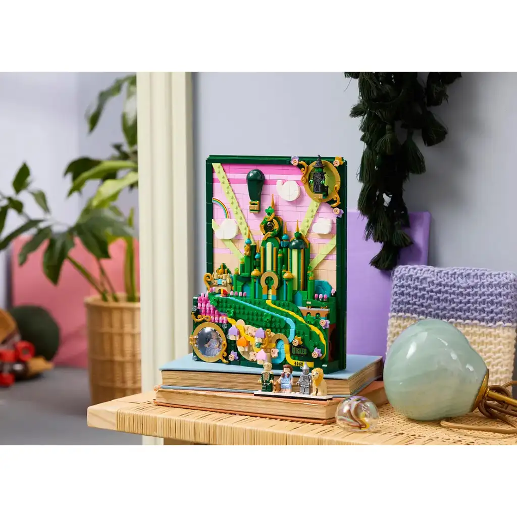 Dieses künstlerische Wicked-Geschenk, das ideal für Frauen, Männer und erwachsene Fans ist, erweckt die Filmszenen in 3D zum Leben. Diese farbenfrohe Dekoration hält wichtige Orte fest wie die Shiz-Universität, Munchkinland und die Smaragdstadt. Im Dekor findest du Glindas Blase, den Zauberwald und ein geheimes Fach, in dem die 4 Figuren (Dorothy Gale, der Feige Löwe, die Vogelscheuche und der Zinnmann als LEGO Minifiguren) versteckt sind. Viele weitere Überraschungen warten darauf, entdeckt zu werden!