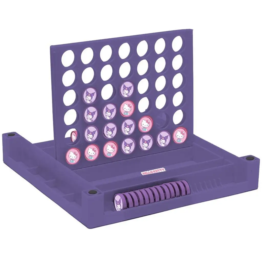 Auf der einen Seite des Spielfelds wartet das bekannte „Leiterspiel“, bei dem Kinder mit Würfeln vorwärts ziehen. Die Leitern helfen beim Aufstieg, während die „Schlangen“ (als lustige Bänder dargestellt) die Spieler zurückwerfen – so bleibt das Spiel immer spannend und voller Überraschungen. Die andere Seite ist für „Vier gewinnt“ reserviert, bei dem das Ziel ist, als Erster vier gleiche Symbole (Hello Kitty oder Kuromi) in einer Reihe – waagrecht, senkrecht oder diagonal – anzuordnen.