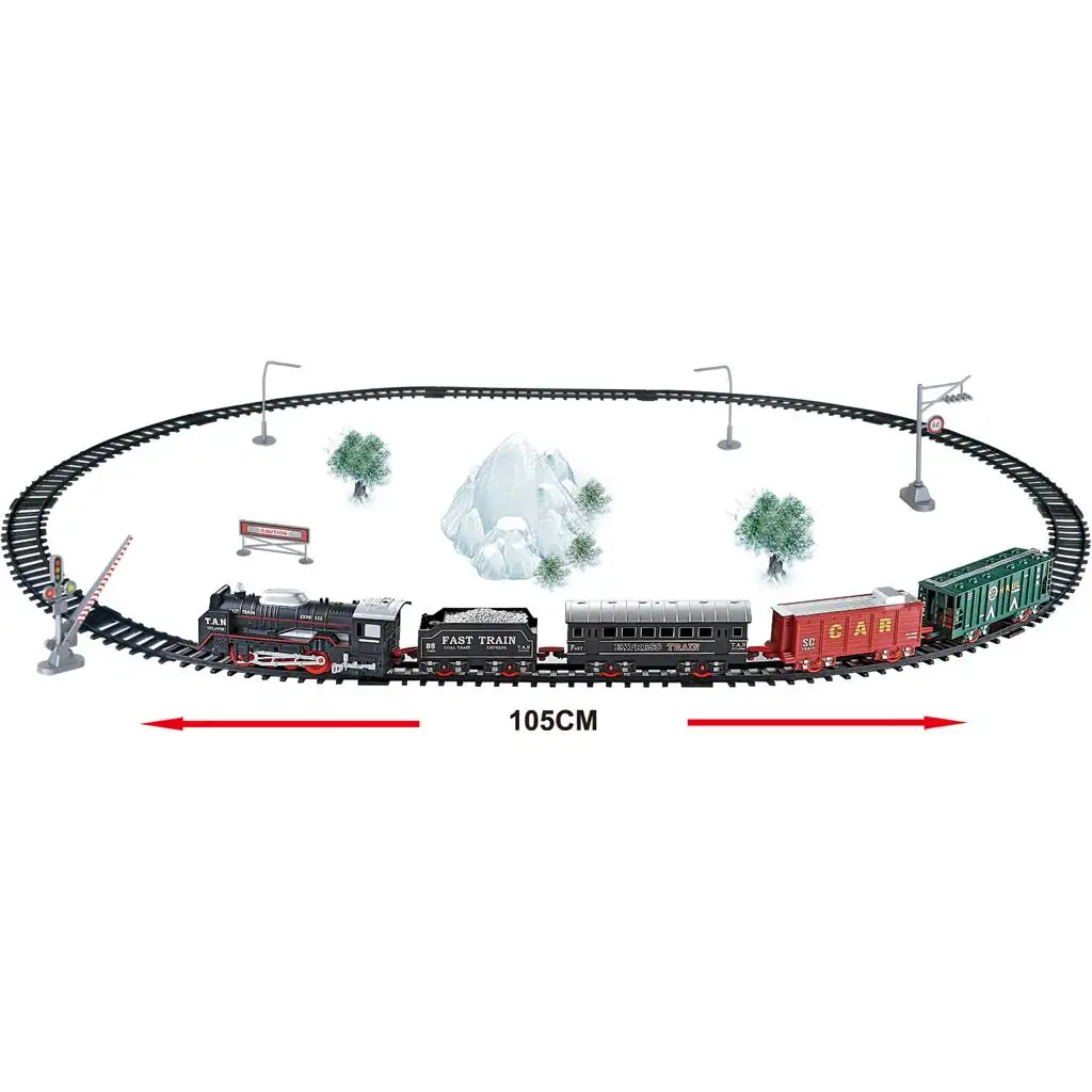 Zum Set gehören die Dampflokomotive, verschiedene Waggons (Kohlen-, Personen- und Güterwagen), Gleiselemente sowie Zubehör wie Lampen, Verkehrsschilder und ein Bahnübergang. Durch den Zusammenbau der Strecke entsteht eine komplett kreisrunde Bahn mit einem Durchmesser von 105 cm, auf der der Zug spannend seine Runden dreht – während der Fahrt leuchtet er und gibt Lokomotivgeräusche von sich, was das Spielerlebnis noch aufregender macht.
