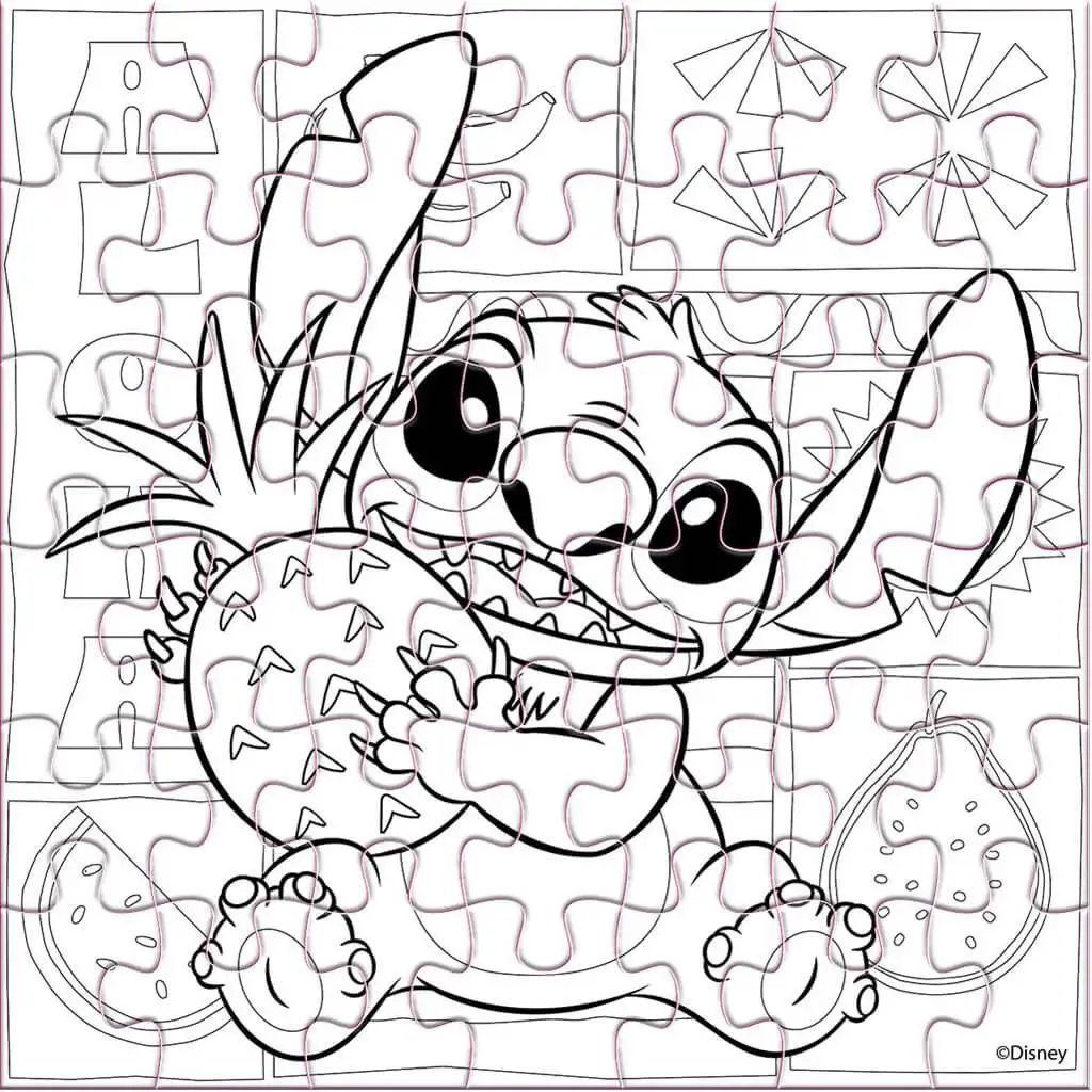 Eine Seite des Puzzles ist bunt: Stitch lächelt und umarmt eine Ananas vor einem tropischen Hintergrund, der voller Früchte, Sonnenschein und sommerlicher Motive steckt. Auf der anderen Seite ist dieselbe Szene als ausmalbare Version – hier kann die Fantasie der Kinder richtig fliegen, wenn sie das Bild nach Belieben mit Buntstiften oder Filzstiften zum Leben erwecken.
