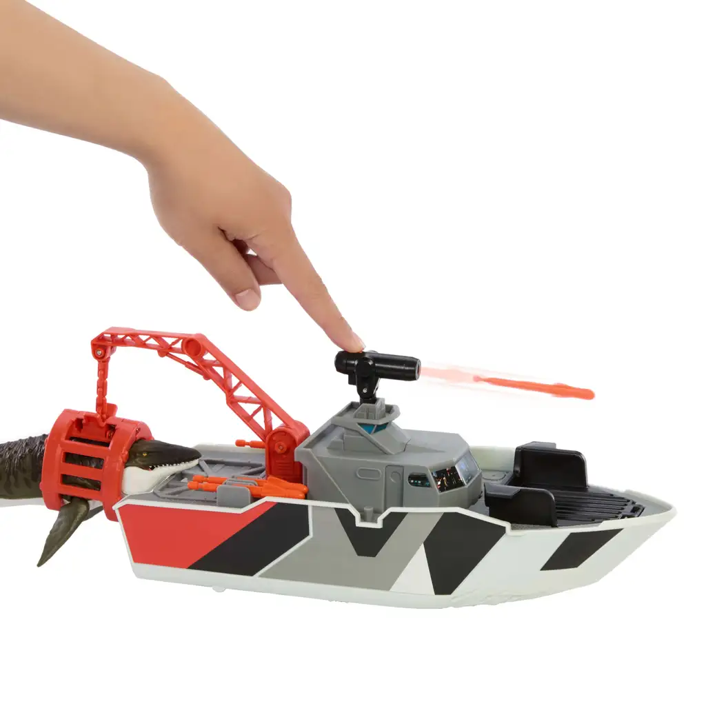 Das über 30 cm große Boot kommt mit realistischen Details und Funktionen, darunter eine funktionierende Winde, mit der du den 33 cm langen Mosasaurus mit beweglichem Kiefer und Flossen einfangen kannst. Am Bug des Bootes befindet sich zudem ein Raketenwerfer mit zwei Harpunen-Raketen – so bist du bereit für jede Rettungsmission oder DNA-Erforschung!
