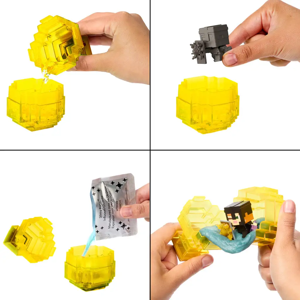 Das Set enthält einen durchsichtigen, Minecraft-inspirierten Trankflaschen-Behälter, eine geheime Figur sowie ein Päckchen Potion Particles Slime-Pulver. Die Kinder gießen einfach Wasser in den Behälter, geben das Pulver dazu, schütteln kräftig – und schon beginnt die magische Verwandlung! Die zunächst einfarbige, graue Figur erscheint in ihrer ganzen Pracht, sobald die Kombination aus Slime und Wasser ihre echten Farben und Details enthüllt.