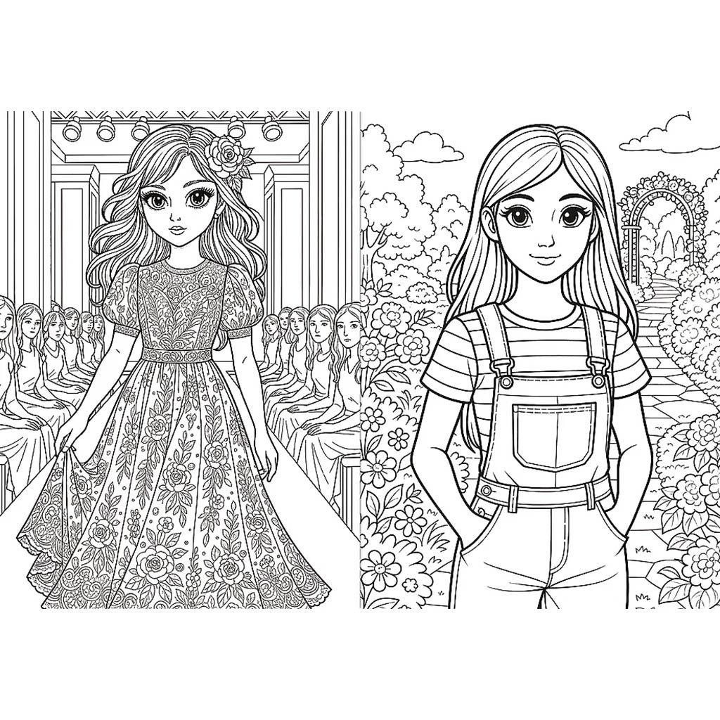 Detailreiche Kleider, Frisuren und Modeaccessoires zum Ausmalen