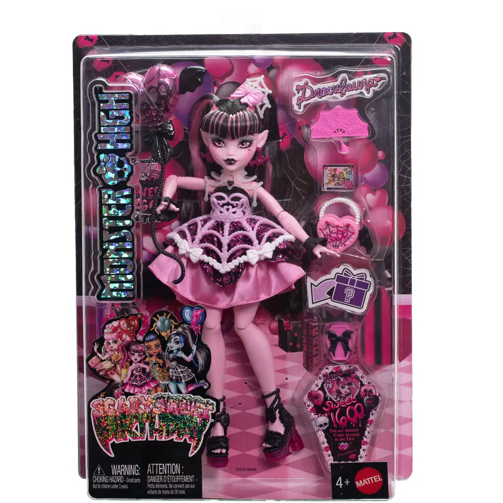 Bereite dich auf eine schaurig-schöne Party bei Monster High: Mystisches Fest – mit Draculaura Puppe vor! Dieses stilvolle Vampirmädchen zählt zu den angesagtesten Schülern der Monster High und kommt jetzt in einem besonderen, zum Geburtstag passenden Set, das das Spielen noch zauberhafter macht. Die Puppe wurde von der beliebten Monster High-Welt inspiriert, in der Freundschaft, die Akzeptanz von Unterschieden und kreativer Selbstausdruck im Mittelpunkt stehen.