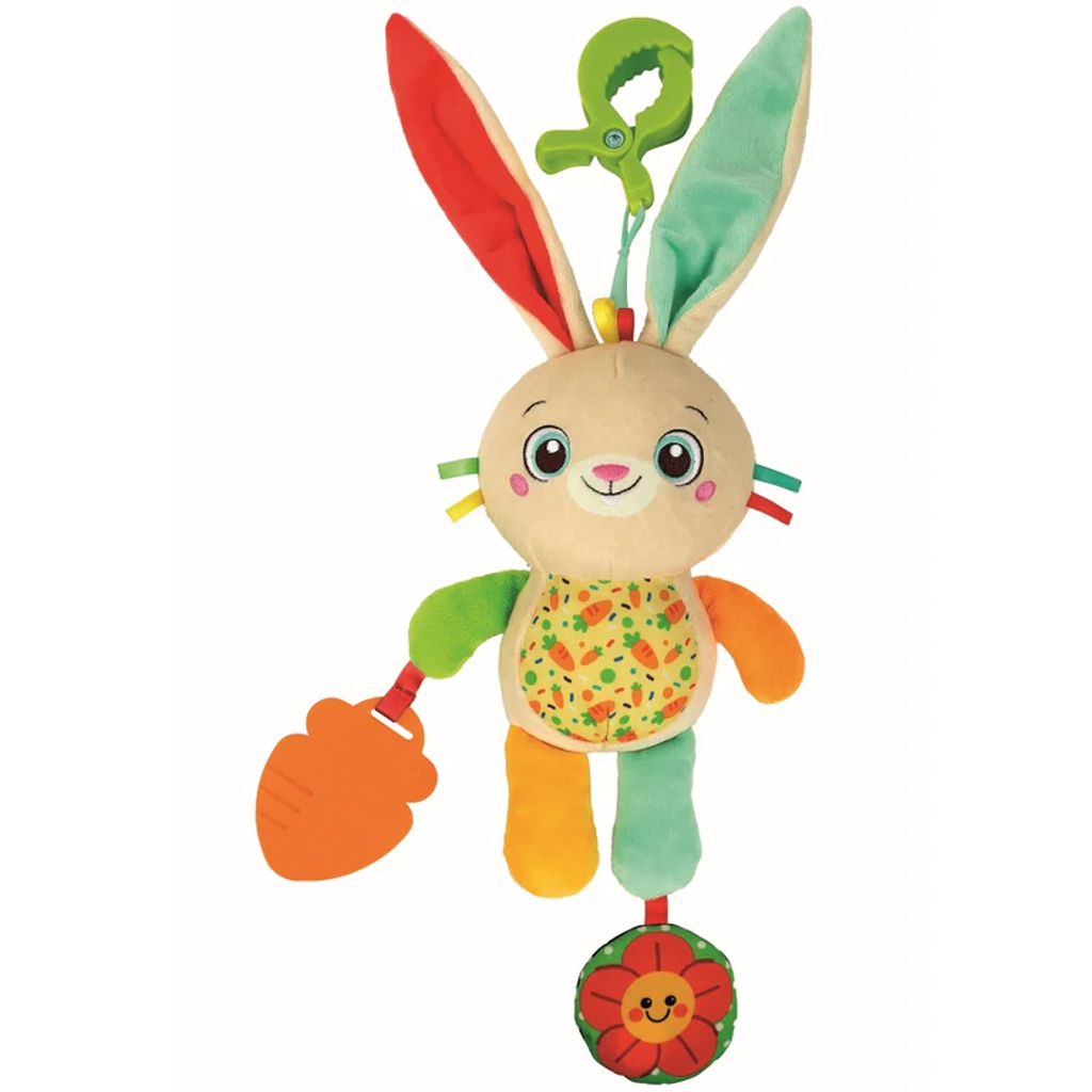 Der On the go Plüschhase ist der perfekte Reisebegleiter für die Kleinsten, ob beim Spaziergang, auf Reisen oder auch beim kurzen Einkaufen. Der auf dem Bild gezeigte, bezaubernde, farbenfrohe Hase ist aus weichem Material gefertigt, sodass er sicher umarmt werden kann und dem Baby ein beruhigendes Gefühl vermittelt. Die langen Ohren, die unterschiedlichen Texturen und die fröhlichen, herabhängenden Accessoires – wie Möhre und Blume – fördern beim Spielen die Wahrnehmung und die Feinmotorik. Mit der praktischen Befestigungsklammer lässt er sich leicht am Kinderwagen, an der Babyschale oder am Gitterbett befestigen, sodass er immer griffbereit ist.