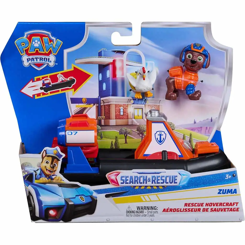 Das Search & Rescue Rückziehauto von Zuma mit Figur lädt Paw Patrol Fans zu spannenden Wasserrettungsaktionen ein. Zuma, der coole und immer fröhliche Wasserrettungshund des Teams, geht jetzt mit seinem eigenen Luftkissen-Rettungsfahrzeug auf Einsatz, um diejenigen in Sicherheit zu bringen, die Hilfe benötigen. Das Design des Fahrzeugs erinnert originalgetreu an die Search & Rescue-Missionen der Serie, und die auffällige orange-blaue Farbgebung sowie die detailreichen Elemente machen das Spielzeug sofort wiedererkennbar.