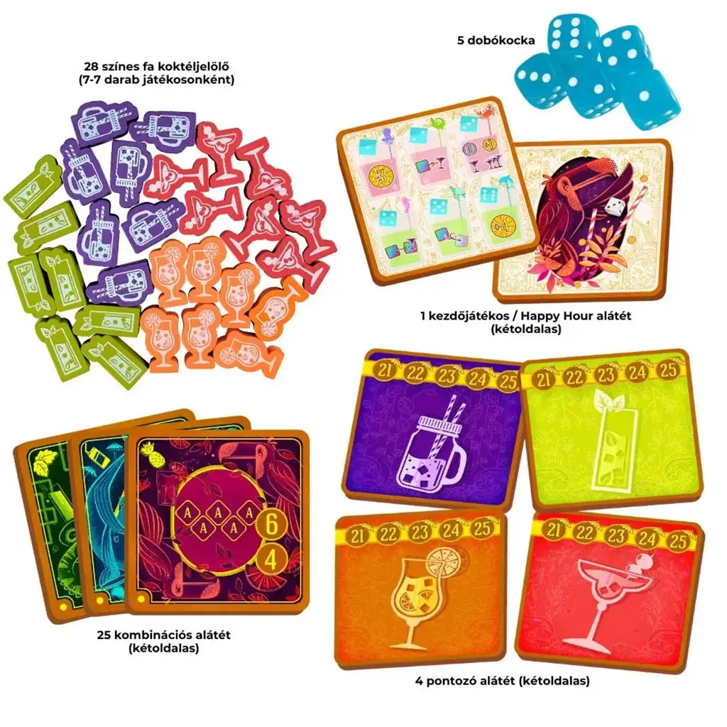 - Lieferumfang: 5 sechsseitige Würfel, 28 Holz-Cocktailmarker, 30 Spieluntersetzer, 1 Regelheft