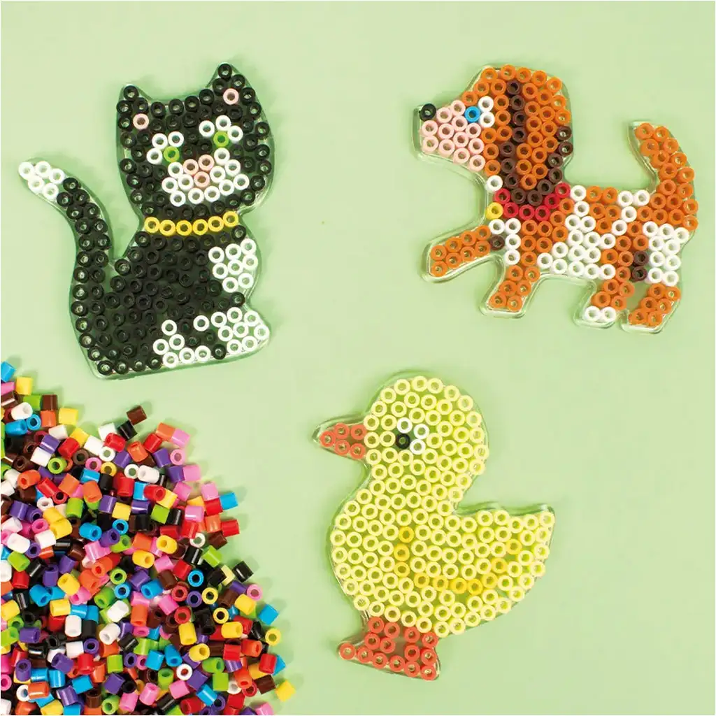 Das PlayBox Tier-Steckplatten-Set ist die perfekte Ergänzung zum Gestalten mit 5 mm MIDI-Bügelperlen. Das Set enthält vier verschiedene, tierförmige Steckplatten: Schmetterling, Küken, Katze und Hund. Auf diesen Steckplatten kann dein Kind die Perlen ganz einfach anordnen und sie anschließend mithilfe von Bügelpapier zusammenbügeln, um haltbare und ansprechende Figuren zu erhalten.